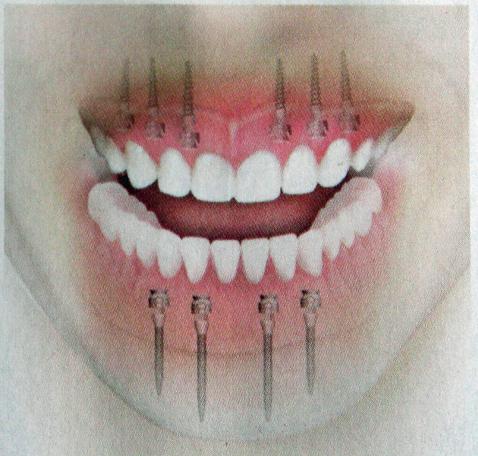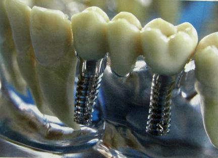 Ein Implantat ist eine künstliche Zahnwurzel, die zur Befestigung von Kronen, Brücken oder Prothesen dient. Sie wird in einem zahnlosen Kieferbereich eingepflanzt. Reines Titan als Metall mit besonders strukturierter Oberfläche wird als Werkstoff für Implantate eingesetzt, da es vom menschlichen Organismus problemlos angenommen wird.